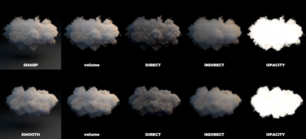 - EXR render with aovs : volume, direct, indirect, opacity